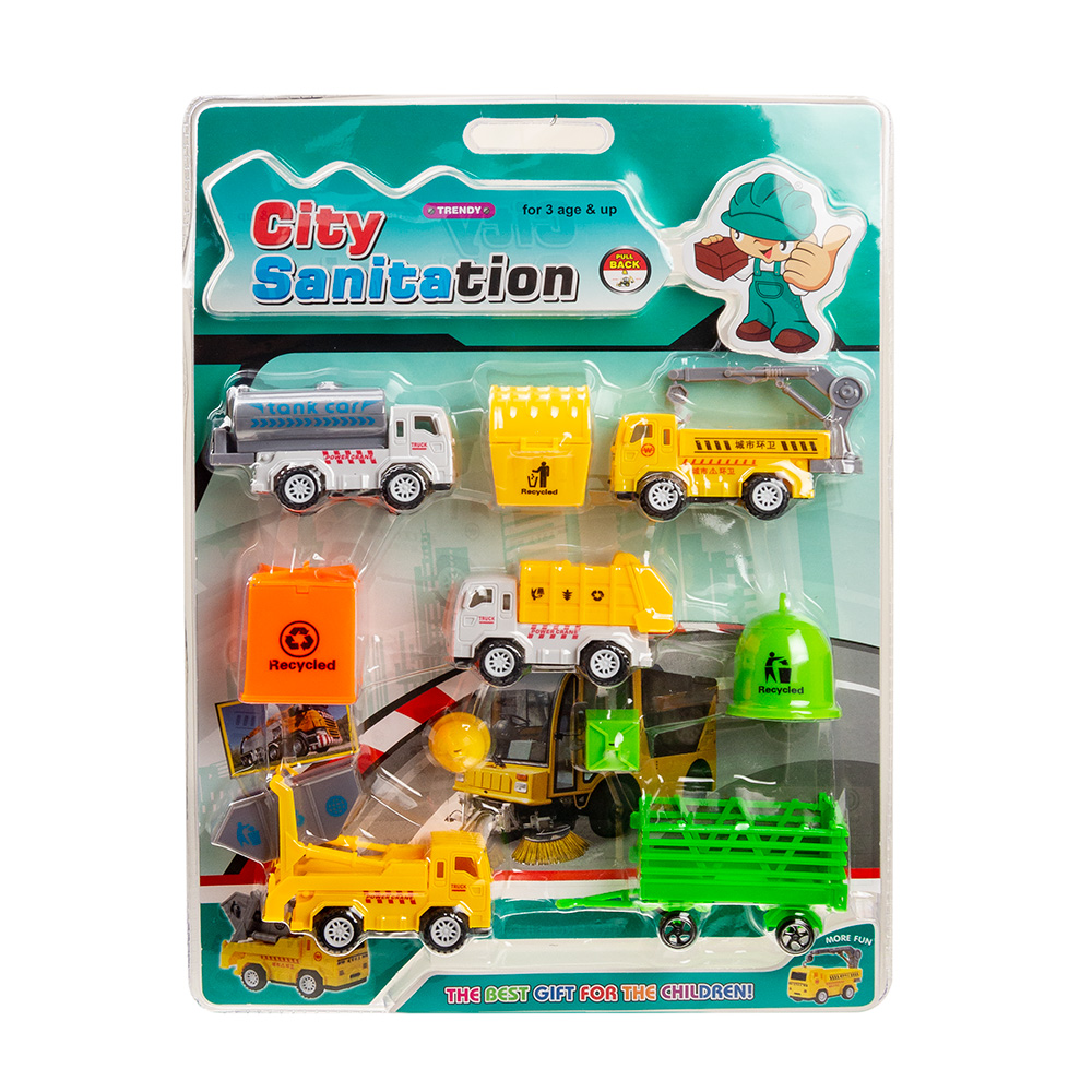 В набор входят специальные уборочные машины,городских служб 4шт размером 8-10см.Контейнера и мусорные баки,дорожные знаки.