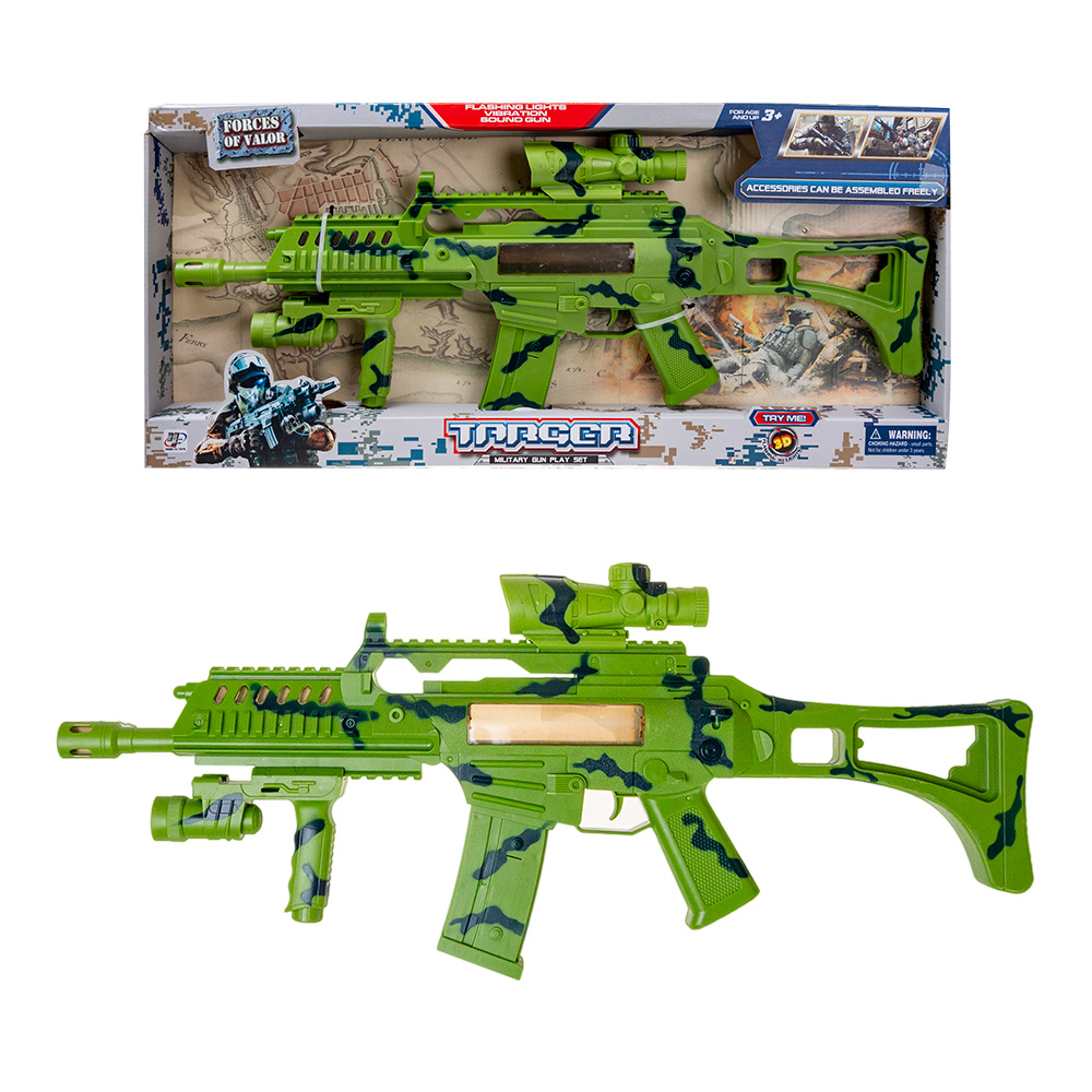Автомат со светом и звуком будет отличным подарком для маленького защитника. Питание осуществляется с помощью 3 батареек типа АА (пальчиковых), которые приобретаются отдельно.