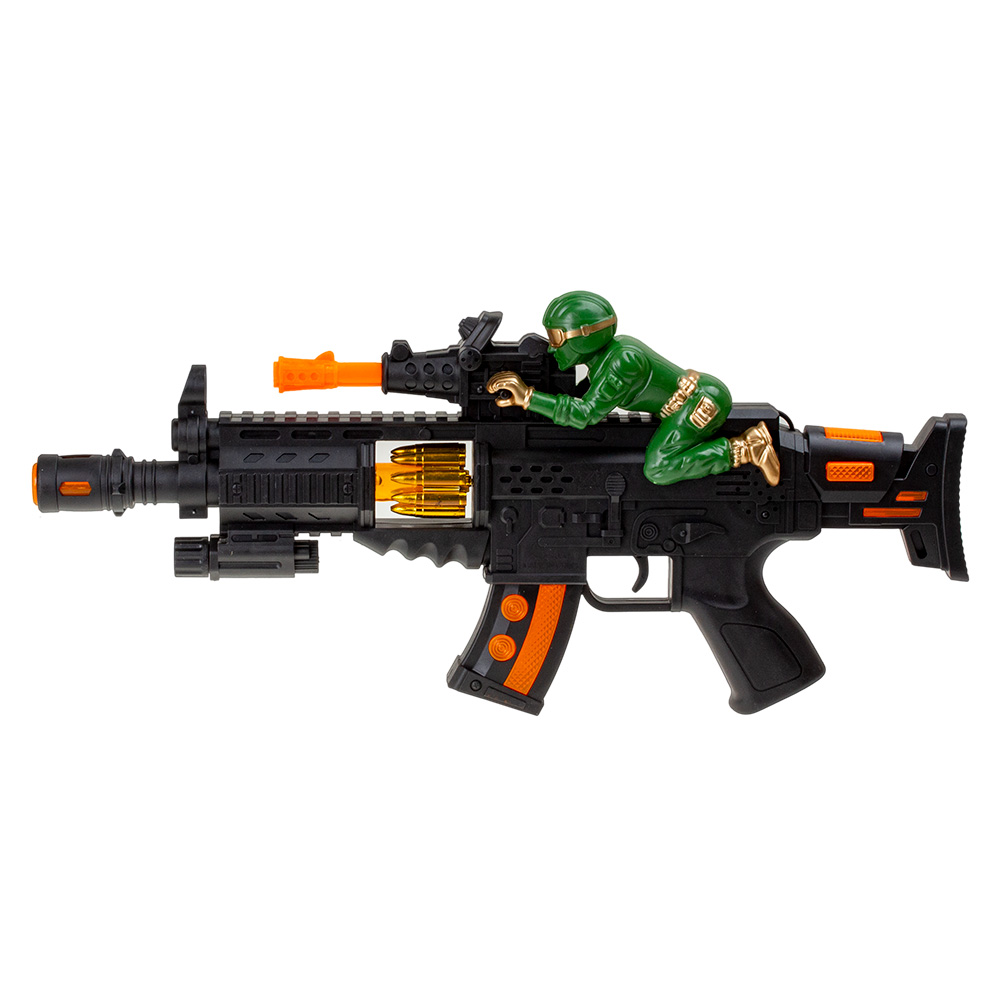 Автомат со светом и звуком будет отличным подарком для маленького защитника. Питание осуществляется с помощью 3 батареек типа АА (пальчиковых), которые приобретаются отдельно.