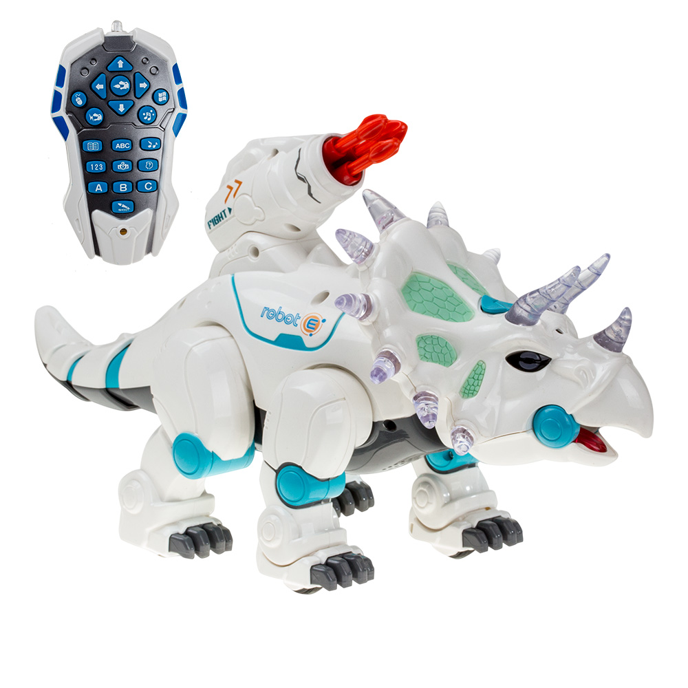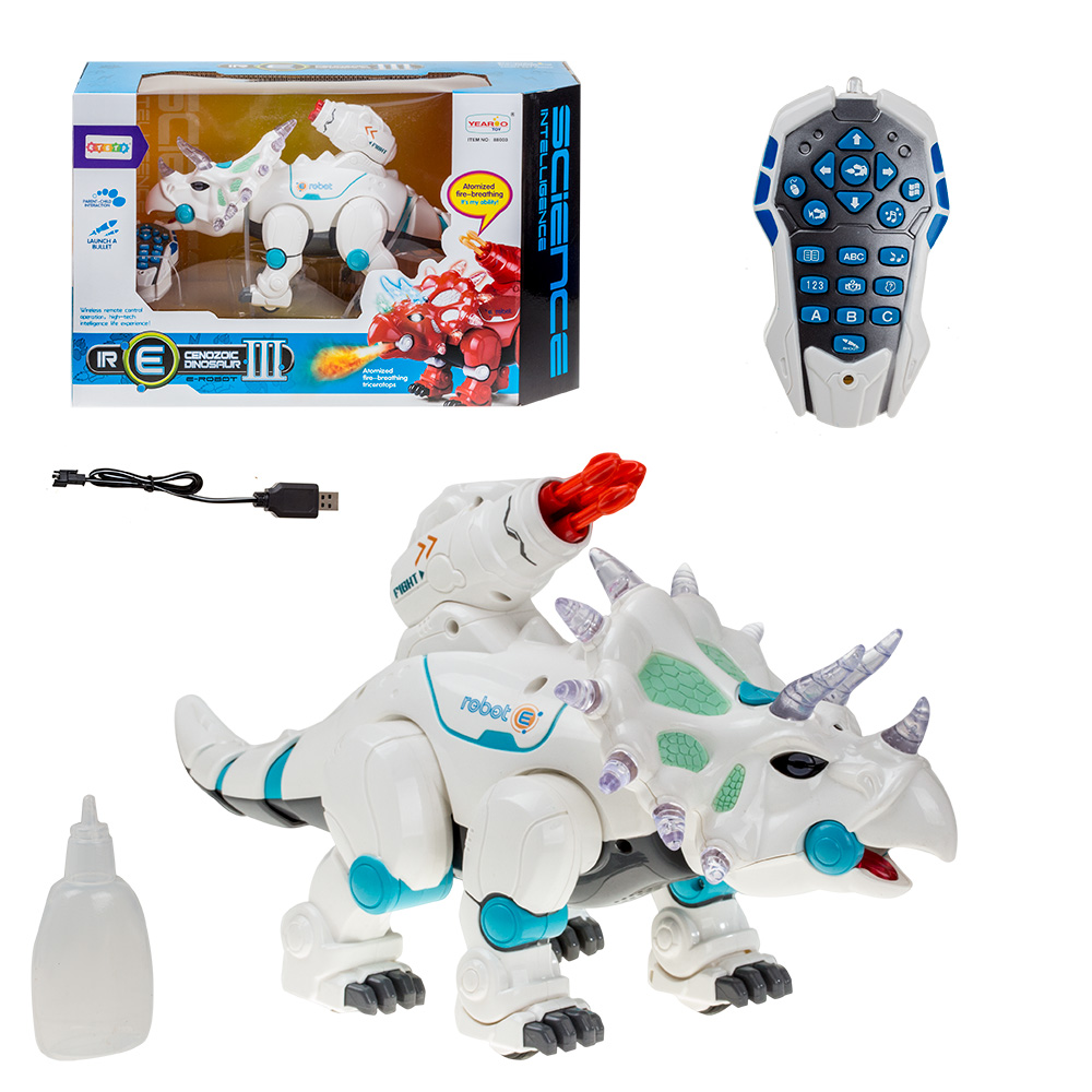 Ребенок сможет сам управлять этим динозавром с помощью пульта. Игрушка двигается вперед, назад, а также у динозавра-робота светятся глаза, оснащен дымовым эффектом. Имеет три скорости движения, танцует, ходит, бегает. На спине расположена трех зарядная пушка. В робота заливается вода - для создания эффекта пара. В комплекте аккумулятор и зарядное устройство В пульт необходимо 2 батарейки типа АА (в комплект не входят)
