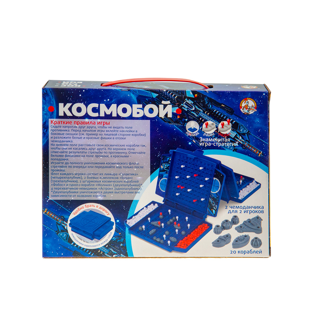 Для поклонников игры в морской бой – новая интерпретация классической игры! Устройте эпичное сражение на космических кораблях и победите соперника, став главным стратегом в бою! Состав игры: • игровое поле (2 шт.) – 16х12х3 см • космические корабли (10 шт. в каждом наборе) • белые фишки – 160 шт. • красные фишки – 40 шт. • декоративные наклейки (2 шт.) Вместо бумаги – полноценные игровые поля, оформленные в чемоданчики, которые скрепляются между собой. Возьми игру с собой в дорогу – и скрась скуку в пути веселой игрой для всех возрастов!