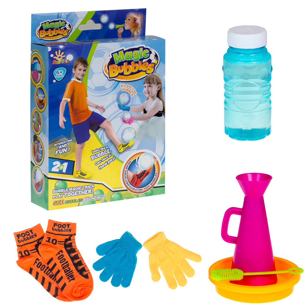 Волшебные мыльные пузыри не лопаются от прикосновения, можно дотронуться рукой. Возможность держать мыльные шарики прямо у себя на руках, при помощи специальных перчаток к пузырям можно дотрагиваться руками и подбрасывать в воздух. Каждый пузырь можно держать в руках и перебрасывать с ладошки на ладошку. В комплекте: перчатки, носки,раствор мыльных пузырей и устройство для выдувания пузырей.