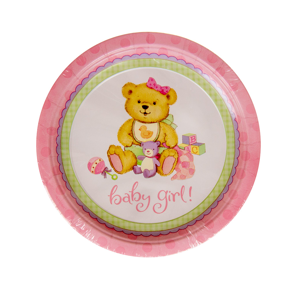 Большие круглые тарелки для встречи новорожденной или дня рождения малыша. Белая серединка с трогательным мишкой, кубиками, погремуш ками обрамлена канвой в нежно-розовый горох. Размер тарелок 23 см, в упаковке - 8 штук.